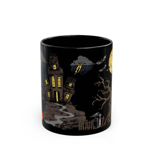 All Hallows Eve Black Coffee Mug (11oz & 15oz) - Spooky Design with Haunted House, Ghost & Moon